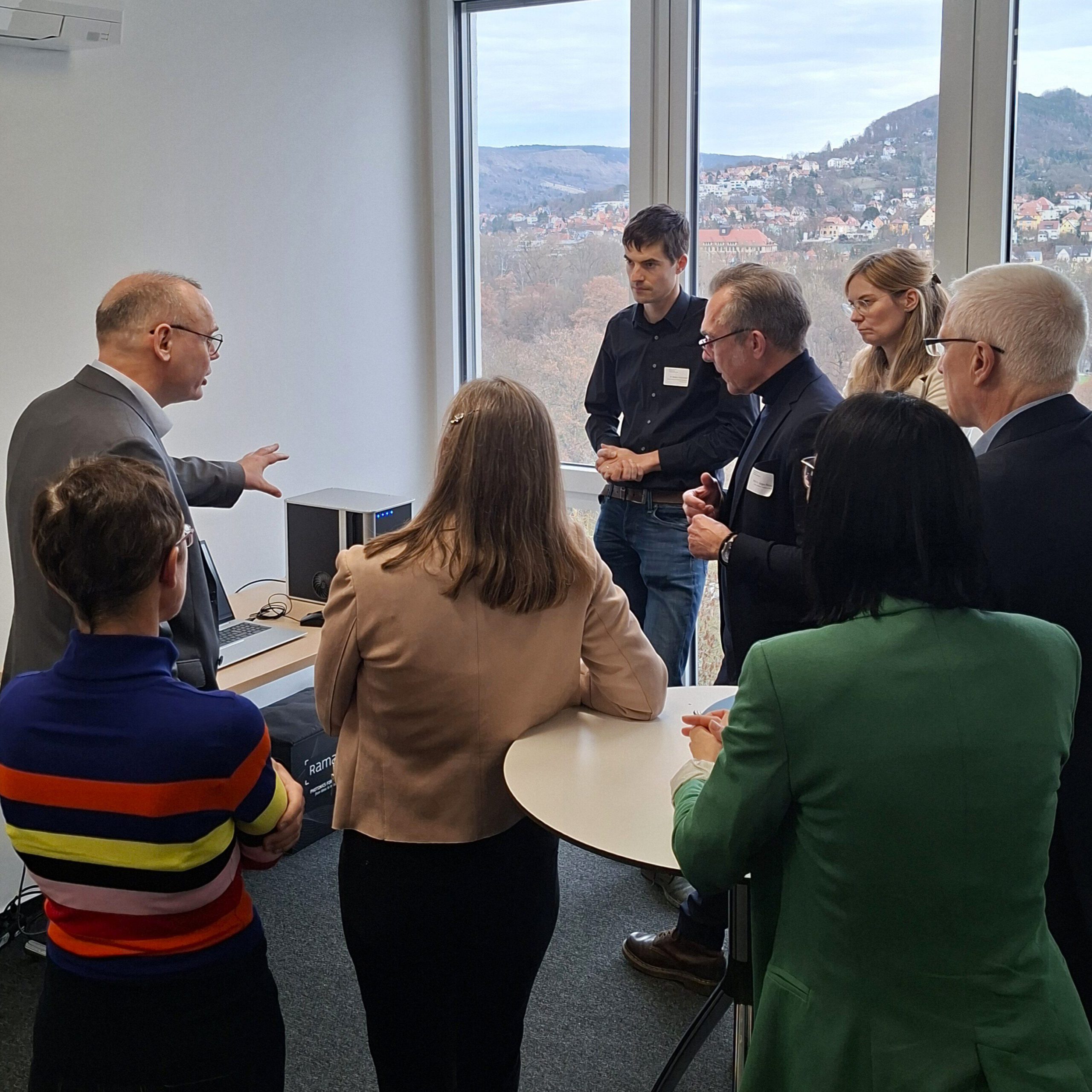 Kurz vor Jahresende versammelten sich Leiter und Wissenschaftler:innen aus den LPI Partnerinstitutionen, um dem Ministerialdirigent Herrn Beyer, Unterabteilungsleiter der Schlüsseltechnologien am BMFTR, neue Eindrücke des LPI Jena und dem Status einiger Basistechnologien zu zeigen. Am Austausch beteiligt waren neben dem Bundesministerium für Forschung, Technologie und Raumfahrt (BMFTR) auch eine Delegatin des Thüringer Ministerium für Bildung, Wissenschaft und Kultur (TMBWK), die LPI Geschäftsführung, sowie Vertreter:innen der vier Konsortialpartner Leibniz-Institut für Photonische Technologien (Leibniz-IPHT), Universitätsklinikum Jena (UKJ), Leibniz-Institut für Naturstoff-Forschung und Infektionsbiologie – Hans-Knöll-Institut e.V. (HKI) und Friedrich-Schiller-Universität Jena (FSU). Im Fokus standen fortgeschrittene Basistechnologien im Kontext der weiteren Entwicklung des LPI und der Aufbau der First-in-Patient-Unit (FiPU) am Uniklinikum Jena.