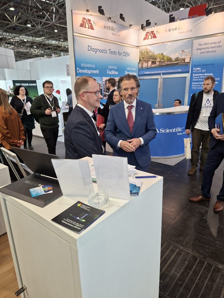 As a special highlight, the state secretary of the Thüringer Ministeriums für Wirtschaft, Landwirtschaft & Ländlichen Raum (TMWLLR) Mario Suckert visited our booth. During his tour at the MEDICA, we introduced him to the LPI and were able to get him interested in our plans.
