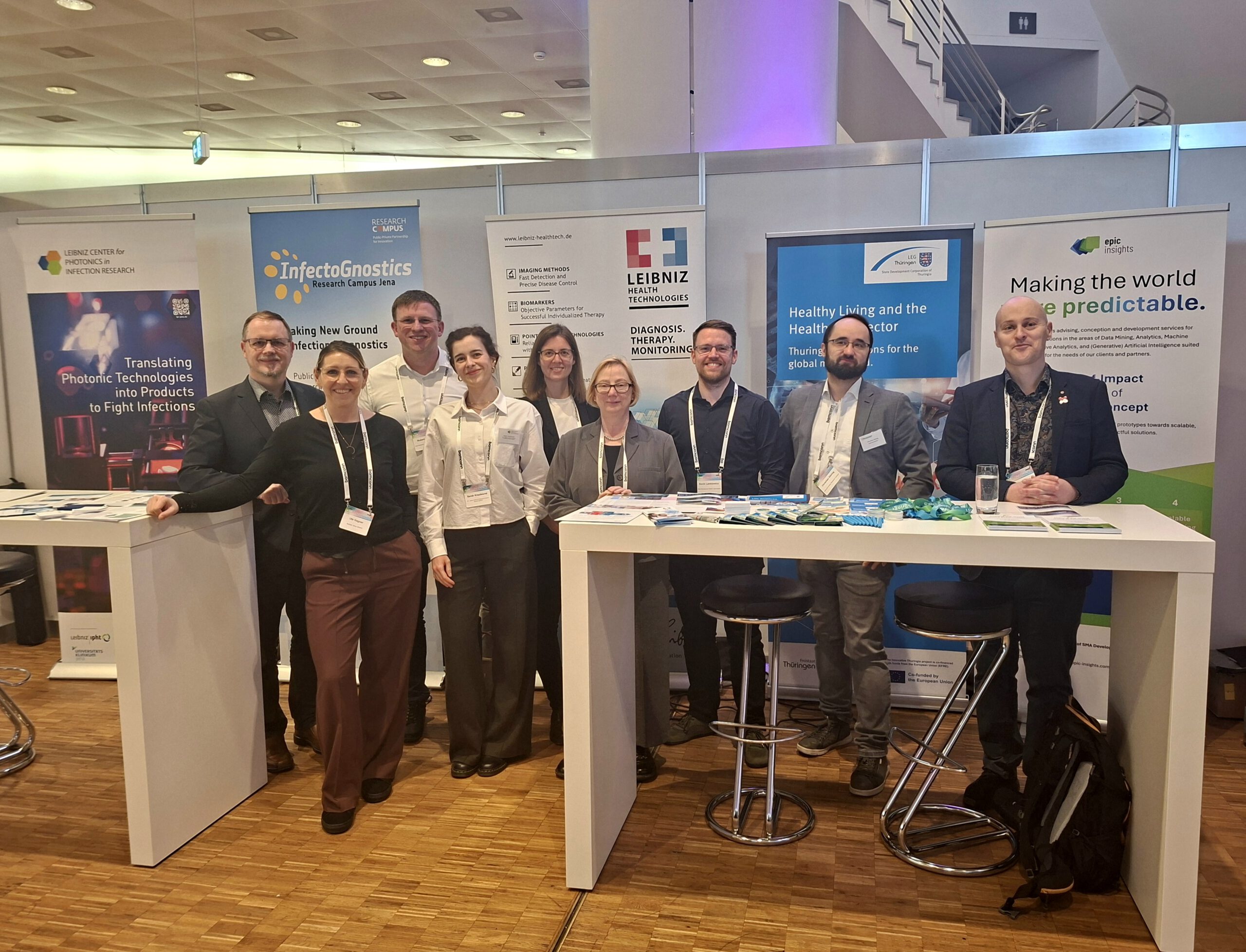 Als eines der Translationszentren im Verbund der Leibniz Gesundheitstechnologien stand das LPI mit am Gemeinschaftsstand der Landesentwicklungsgesellschaft Thüringen mbH (LEG Thüringen). Viele Besucher der Messe strömten gezielt oder zufällig am Stand vorbei, wodurch wir uns mit Interessenten vernetzen und neue potentielle Partnerschaftskontakte knüpfen konnten. Der Fokus lag dabei vor allem darauf, über die Alleinstellungsmerkmale des LPI in Form der First-in-Patient Unit (FiPU) und des geplanten LPI Laborgebäudes zu informieren. Diese spielen eine zentrale Rolle bei dem Ziel des LPI, im Kampf gegen Infektionskrankheiten innovative photonische Technologien in die klinische Routineanwendung zu überführen. Das LPI möchte die Lücke schließen, die für vielversprechende Forschungsergebnisse und Technologien eine große Hürde darstellen: der Übergang von Proof-of-Concept in die medizinische Versorgung. Unsere Infrastruktur befindet sich aktuell im Aufbau – ab 2027 sollen dann erste Point-of-Care Pilotstudien in der FiPU umsetzbar sein.
